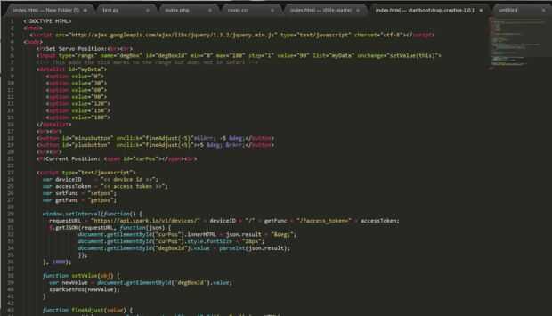 <!DOCTYPE HTML> <<span class="hljs-title">html></span> <<span class="hljs-title">script src="http://ajax.googleapis.com/ajax/libs/jquery/1.3.2/jquery.min.js" type="text/javascript" charset="utf-8"></span></<span class="hljs-title">script></span> <<span class="hljs-title">body></span> <<span class="hljs-title">P></span>Set Servo Position:<<span class="hljs-title">br></span><<span class="hljs-title">br></span> <<span class="hljs-title">input type="range" name="degBox" id="degBoxId" min="0" max="180" step="1" value="90" list="myData" onchange="setValue(this)"></span> <!-- This adds the tick marks to the range but does not in Safari --> <<span class="hljs-title">datalist id="myData"></span> <<span class="hljs-title">option value="0"></span> <<span class="hljs-title">option value="30"></span> <<span class="hljs-title">option value="60"></span> <<span class="hljs-title">option value="90"></span> <<span class="hljs-title">option value="120"></span> <<span class="hljs-title">option value="150"></span> <<span class="hljs-title">option value="180"></span> </<span class="hljs-title">datalist></span> <<span class="hljs-title">br></span><<span class="hljs-title">br></span> <<span class="hljs-title">button id="minusbutton" onclick="fineAdjust(-5)"></span>⇐ -5 °</<span class="hljs-title">button></span> <<span class="hljs-title">button id="plusbutton" onclick="fineAdjust(+5)"></span>+5 ° ⇒</<span class="hljs-title">button></span> <<span class="hljs-title">br></span><<span class="hljs-title">br></span> <<span class="hljs-title">P></span>Current Position: <<span class="hljs-title">span id="curPos"></span></<span class="hljs-title">span></span><<span class="hljs-title">br></span> <<span class="hljs-title">script type="text/javascript"></span> <span class="hljs-keyword" style="font-weight: bold;">var deviceID = "<< device id >>"; var accessToken = "<< access token >>"; var setFunc = "setpos"; var getFunc = "getpos"; window.setInterval(<span class="hljs-keyword" style="font-weight: bold;">function() </span>{ requestURL = "https://api.spark.io/v1/devices/" + deviceID + "/" + getFunc + "/?access_token=" + accessToken; $.getJSON(requestURL, <span class="hljs-keyword" style="font-weight: bold;">function(json) </span>{ document.getElementById("curPos").innerHTML = json.result + "°"; document.getElementById("curPos").style.fontSize = "28px"; document.getElementById("degBoxId").value = parseInt(json.result); }); }, 1000); <span class="hljs-keyword" style="font-weight: bold;">function setValue(obj) </span>{ var newValue = document.getElementById('degBoxId').value; sparkSetPos(newValue); } <span class="hljs-keyword" style="font-weight: bold;">function fineAdjust(value) </span>{ var currentValue = parseInt(document.getElementById('curPos').innerHTML); var setValue = value + currentValue; sparkSetPos(setValue); document.getElementById("degBoxId").value = setValue; } <span class="hljs-keyword" style="font-weight: bold;">function sparkSetPos(newValue) </span>{ var requestURL = "https://api.spark.io/v1/devices/" +deviceID + "/" + setFunc + "/"; $.post( requestURL, { params: newValue, access_token: accessToken }); } </span></<span class="hljs-title">script></span> </<span class="hljs-title">body></span> </<span class="hljs-title">html></span><br>