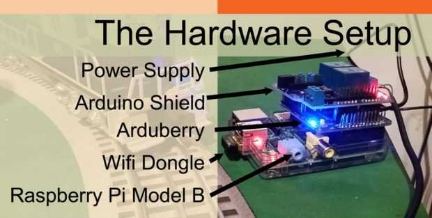 Configuración de las piezas es muy sencilla. Conectamos el Pi en la red local wifi de casa, alimentación vía USB con la fuente de alimentación de Raspberry Pi. El Arduberry se desliza sobre la Raspbery Pi. El Arduino relé escudo encaja directamente en el Arduberry.