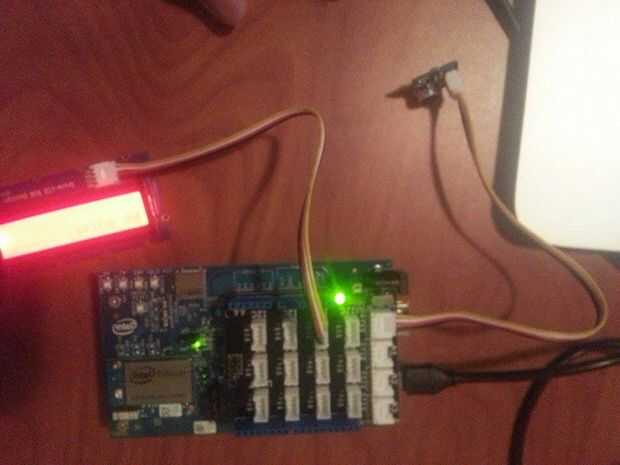 Una Intel Edison a Junta de expansión y conecte el escudo del motor. Ahora como puede verse en la imagen, sensor de sonido está conectado a A0 en el escudo del motor y LCD está conectado a 12C.