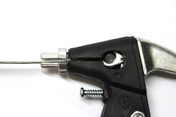 Tome la palanca de freno y darle la vuelta. Un lado tendrá un orificio redondo con una raja hasta el tornillo de ajuste. Gire el tornillo de ajuste del cable de modo que el corte en el está en línea con la ranura en el cuerpo. También ajustar el corte de la tuerca para estar en línea. Cuando los 3 están en posición, se puede colocar fácilmente el tapón del cañón en el extremo del cable de freno en su soporte en el agujero redondo. Luego coloque el cable del freno a través de la ranura hacia fuera a través del orificio del tornillo de ajuste de cable, como se muestra en la segunda imagen. Apriete la tuerca y el tornillo. Una vez fuera de la alineación, el cable no será capaz de deslizarse fuera de la ranura.