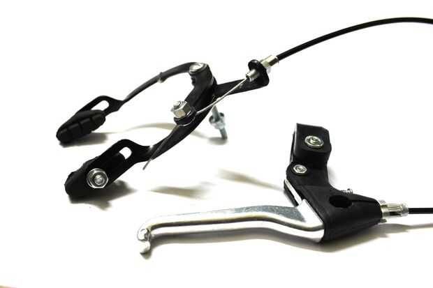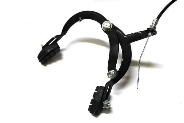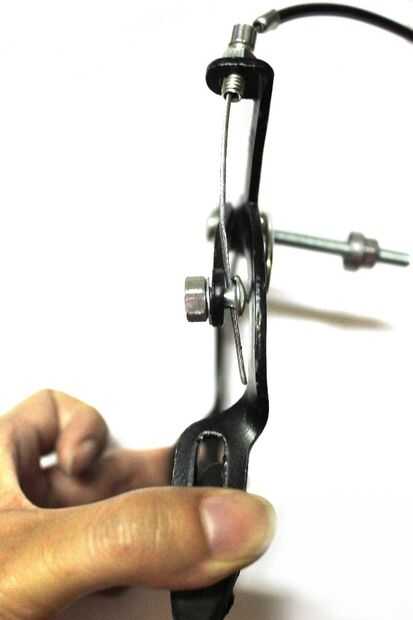 Coloque la funda sobre el alambre. Tome el otro extremo del cable y pase a través del cañón de ajuste como se muestra en la tercera imagen. Desenroscar el tubo de ajuste hasta su máximo. Estire el alambre lo más posible y presione ligeramente las zapatas de freno hacia los demás. La distancia entre los electrodos debe ser aproximadamente el ancho de la manija de taladro incluyendo el botón de disparo. Coloque y apriete el extremo suelto del cable de freno al tornillo del ancla. Libere la presión de los frenos y deben conservar su posición. Presione la palanca de freno y los frenos de pinza deben imitar el movimiento.