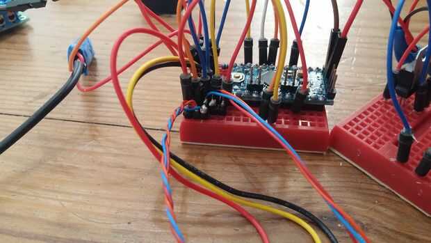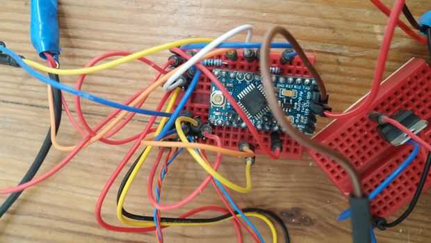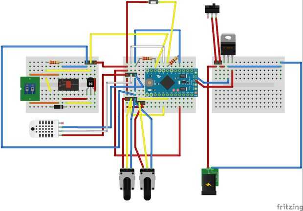 Arduino pro mini (5v) 2 x 220 ohm resistencias 2 x 1 k potenciómetros Módulo realmente AM2301 (caja DHT22) humedad / sensor de temperatura Regulador de 5V Manojo de cables Pulsa el botón (utilicé un botón de timbre)
