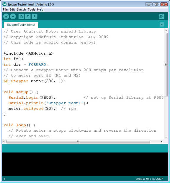 Conectar el arduino con el escudo del motor paso a paso. Descargar e instalar las bibliotecas motor paso a paso de adafruit. He decidido no hacer uso de la biblioteca de AccelStepper. Esto es una sencilla aplicación y no requieren control de movimiento suave. Sólo somos solos el motor de escalonamiento. Se muestra un ejemplo muy básico de rotación de las agujas del reloj entonces contra las agujas del reloj. No hay amortiguación de movimiento es necesario. Descargar los programas de sketch de arduino desde Github jbvolcontrol. Crear un nuevo dibujo en blanco. Cargar el código en el ejemplo siguiente.
