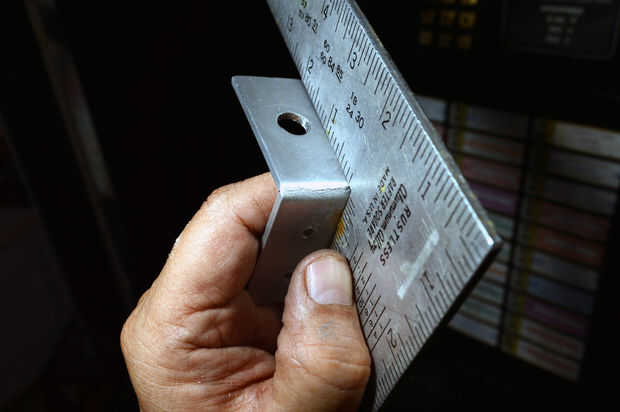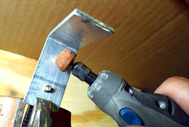 Se trata de un soporte en L lujo montar el reostato al proyecto. Aluminio se utiliza para que la estética y la facilidad para trabajar con. Tome una 1 "x 4 x 1/8" "pedazo de aluminio stock y escriba en la línea de centro. Fijar los valores a una tabla se estabilice durante el amolado. Use una Dremel para cortar una ranura a la mitad de la población. Ángulo como una V de modo que cuando está doblado no se agriete en la parte posterior. Poner el caldo en el vicio y doblar a 90 grados. Comprobar con una escuadra T de la curva. Alinee el conjunto del eje del motor con el Monte del reóstato. La marca el soporte de aluminio en la línea de centro del eje. Perfore un agujero del tamaño del eje del reóstato y añadir una pequeña sala de meneo. Perfore un par de pequeños agujeros para atornillar el soporte a la placa base. Afile las rebabas de metal alrededor de los orificios. El soporte está listo para montar en la placa base.