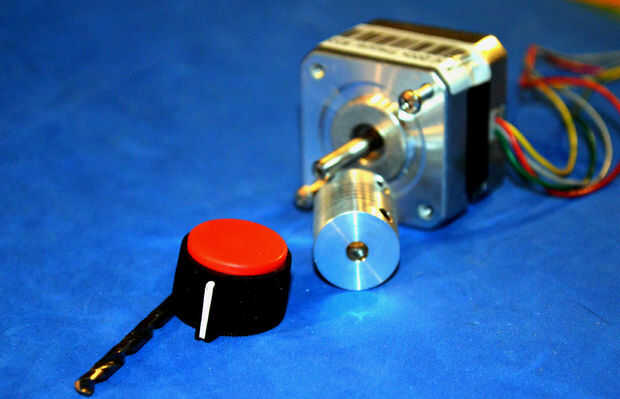 Coloque el acoplador de eje motor de aluminio en el eje del motor paso a paso. Asegúrese de que el lado plano del eje se alinea con uno de los tornillos de fijación. Apriete con una llave hexagonal. Haz una perilla que se ajuste el reóstato de control de volumen de jukebox. El tamaño de un tornillo de máquina que se ajusta el diámetro interno del enganche motor. Cortar el tornillo de máquina en 0,75" de largo. La rutina de cualquier exceso fresas. El tamaño de una broca de taladro para que coincida con el diámetro exterior del tornillo de la máquina. Perfore un agujero en el centro de la perilla de control de volumen plástico. Empuje el tornillo en el orificio de la perilla. Uso de epoxy para pegar el tornillo del acoplador. Apriete el tornillo en el acoplador de aluminio. Ahora el reóstato de control de volumen y ser dado vuelta por un motor paso a paso.