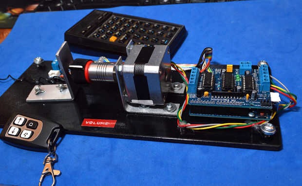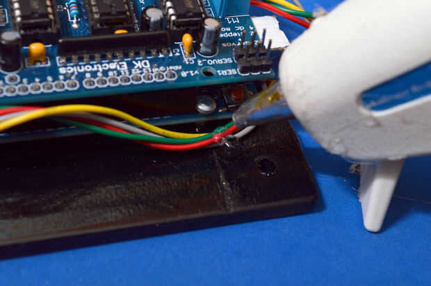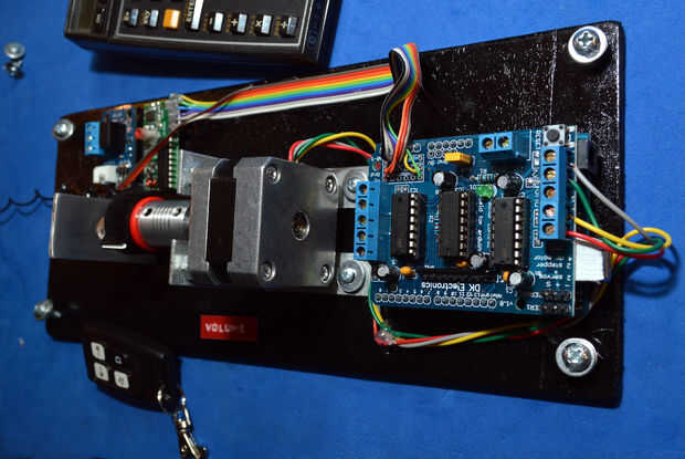 Cortar un trozo de madera bastante grande del perno en el soporte del motor y el reostato. Encontré un 11 "x 4" pieza de tilo práctico. Lije los bordes y perfore agujeros en las esquinas. Encontrar algunos tornillos que van a través de la placa de montaje y en el gabinete, pero no todo el camino a través del gabinete. Pintar la madera negra de la placa de montaje. Alinear los componentes a montar en la placa de montaje. Tomar el escudo del motor de la arduino. Tornillo de la arduino a la placa de montaje con tornillos pequeños. Colocar el protector de motor en el arduino. Fije el soporte del motor a la placa de montaje con tornillos para madera. Pegue el módulo RF en la placa de montaje. Pegue el arranque relé a la placa de montaje. Fije el reóstato a la placa de montaje con tornillos para madera.
