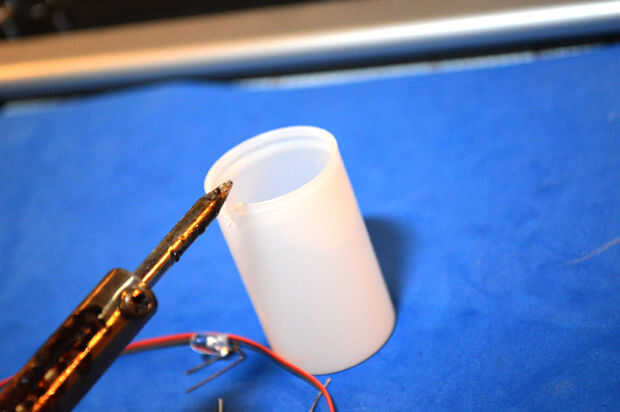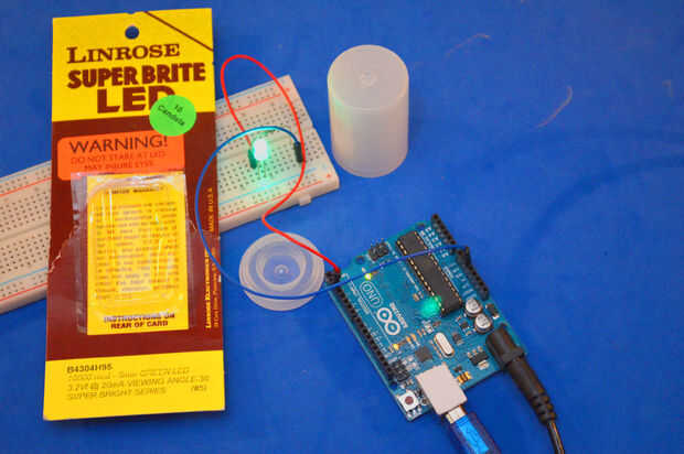 Cuando el control de volumen esté hacia arriba o hacia abajo de un LED indicador se utiliza para mostrar sonido nivel se cambia. Puede un alto rendimiento que LED está montado en una película de plástico. Enciende cuando el motor paso a paso es cambiar de dirección. Este es uno de los ejemplos más simples de código de arduino. Se utiliza una resistencia de 220 ohm para limitar la corriente de exceso. El LED se pega a la base de la lata de película. Se corta una muesca en la can para permitir que los cables conectar al espacio de proyecto de controlador de motor. La película puede entonces se pega a la placa de montaje. El cable del ánodo del diodo se suelda al escudo del motor en la clavija del D2. El resistor y el lado del cátodo se sueldan con el conector de tierra.