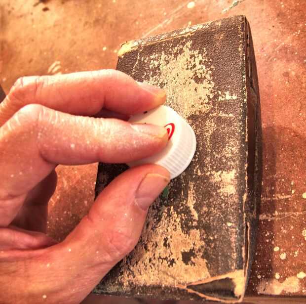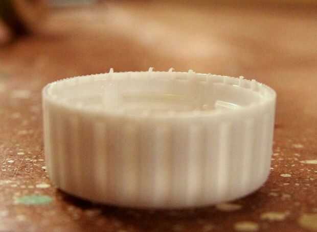 El primer paso es quitar los pernos pequeños (segunda foto) en el borde de la tapa de la botella, que fue utilizado para colocar el anillo de fijación plástico alrededor del cuello de la botella. Simplemente lijar (cuadro 3).