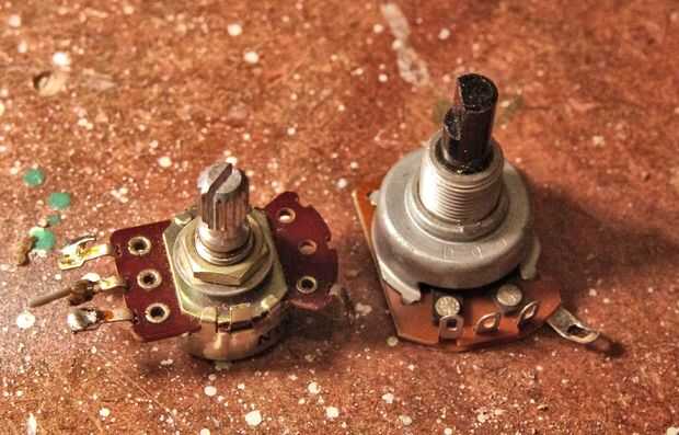 Los tipos de tapas de botellas que uso tienen un diámetro de 25 mm dentro de tanto, la mayoría potenciómetros utilizan un eje de 6 mm de diámetro. Tienes dos tipos principales de eje de potenciómetro: un estriado (a la izquierda en el primer cuadro) y donde se fija la perilla en el eje con un tornillo pequeño al lado (mano derecha en un primer cuadro), pero por suerte ambos tipos son 6 mm de diámetro.