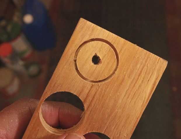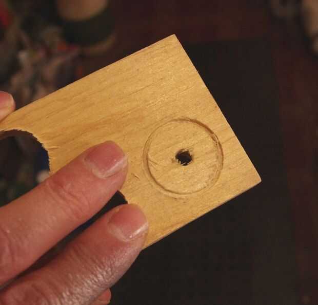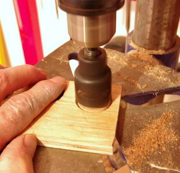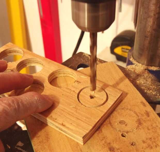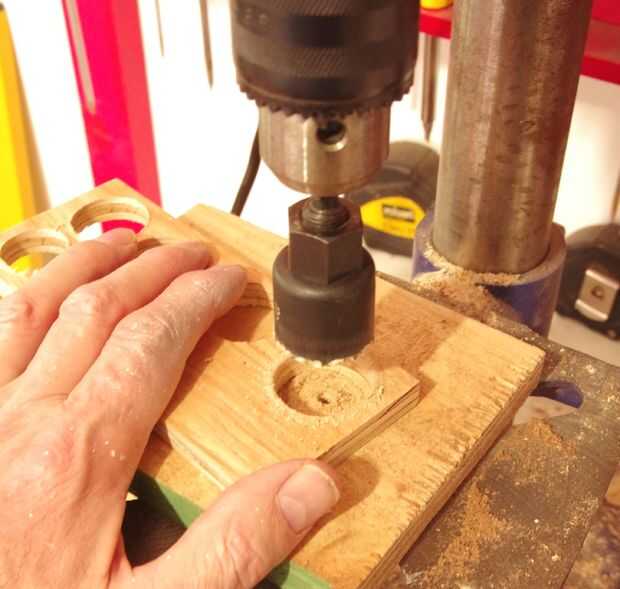 Gire derecha lado para arriba otra vez y ahora montar la broca de 6 mm para taladro (cuarta foto). Sujeta la madera ligeramente en su lugar, lentamente baja la broca en el agujero en el disco, para que la broca puede centro de sí mismo en el agujero moviendo ligeramente la madera. Ahora firmemente agarre la madera y bajar la broca de más, pero todavía poco a poco, hasta que la broca haya pasado a través de la madera. Si usted no trabaja con cuidado y lentamente, la broca el bosque del gancho agarrador y arruinar el agujero.