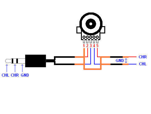 Encontrar un conector de audio 3.5mm Macho con algún alambre a la izquierda en él, corte el cable donde desea que el bote para ir. Ahora coge su ruedita y todas las vainas de la tierra juntas y luego a la izquierda de la soldadura más pin (Pin 1). Después de la soldadura el canal (CH) los cables desde el conector macho al Pin 2 CHR & Pin 3 para CHL, luego los cables de salida al conector hembra se soldar respectivamente al Pin 4 de CHL y Pin 5 para CHR.