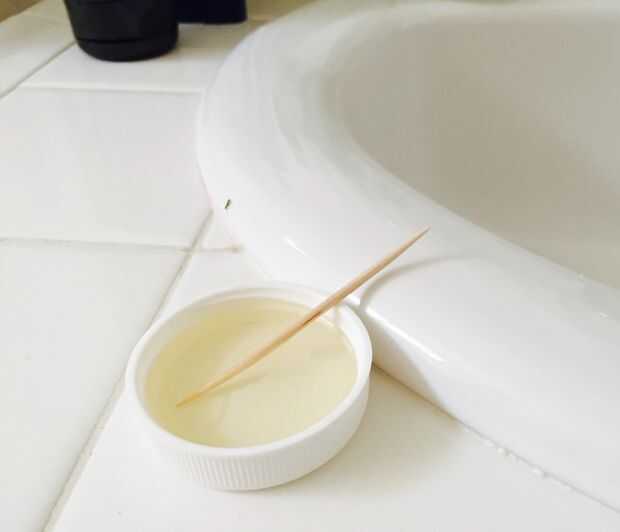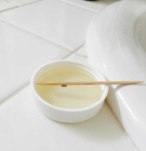 Ahora vierta parte del bórax/azúcar líquido en una tapa de botella de plástico, no demasiado completa y agregar un palillo de dientes. El palillo de dientes le permite dirigir las hormigas en investigar el contenido de la tapa. Puede sostener un extremo de los palillos de dientes contra la pared de la derecha donde la línea ant es. En este caso, estaba trabajando en el cuarto de baño y sólo pudo encontrar dos hormigas, ya que mis métodos generalmente mantienen bajo control la mayor parte. No pasó mucho tiempo antes de que uno de ellos había encontrado el "convite" en su propia.