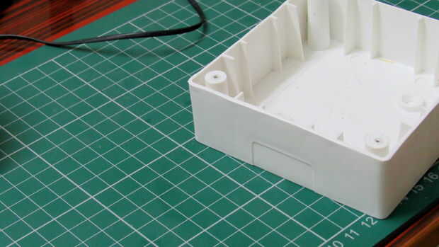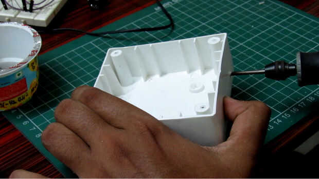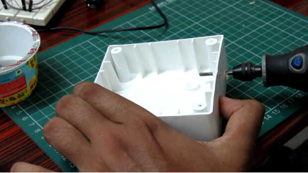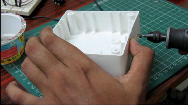 Tomé un 4 x4 x2 caja. Me comenzó a hacer un agujero en la conexión para el cable de alimentación entrar a través de esta i luego utiliza un carburo de silicio pulido poco a suavizar el agujero.