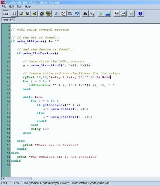 Este proyecto es presentado a usted por la magia de RobotBASIC. RobotBASIC (RB) es un lenguaje de programación libre y el IDE (entorno de desarrollo integrado). Tiene soporte para el control de la USBmicro U451.