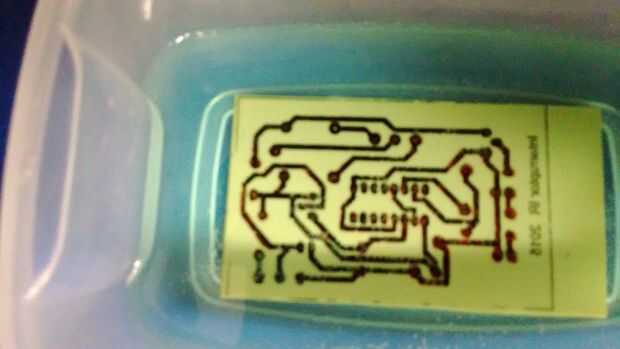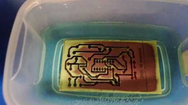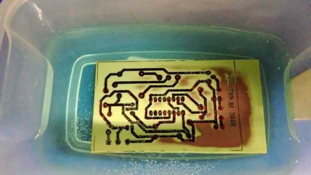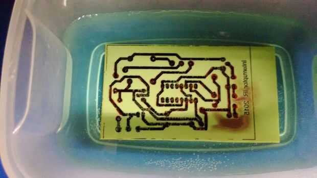 En este paso cuántos dos partes de ácido muriático por una parte de agua oxigenada es sumamente sencillo deberían protegerse los ojos y las manos, no derramen el ácido muriático luego se introduce la placa y movemos constantemente.