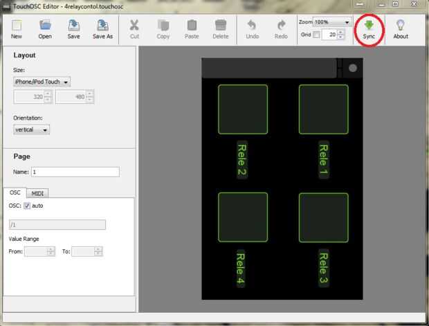 Ahora con touchOSCeditor abrir el archivo 4relaycontol.touchosc y presione el botón de sincronización, pulsado una vez en la aplicación de teléfono ir a Layout y pulse Añadir