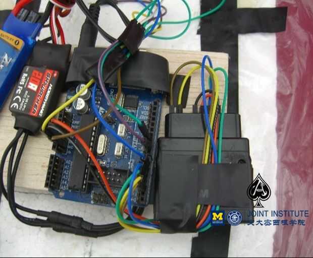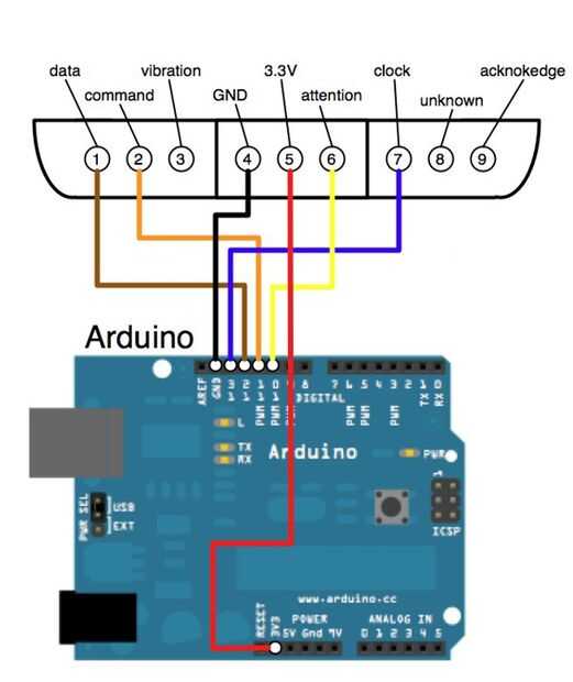 1. Conecte los cables entre la placa Arduino y el receptor controlador como figura 39. Conecta 4 a la "Tierra", 5 a 3,3 "v", 2 y 6 a dos puertos PWM (marcados con "PWM"), 1 y 7 a dos puertos digitales (marcados con "DIGITAL" sin "PWM").