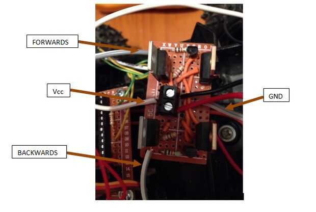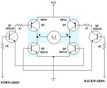 El puente H es necesario porque es lo que permite un motor correr adelante/atrás. Para crear este dispositivo hemos utilizado dos BD243 transistores, dos transistores TIP32C y dos transistores 2N2222 además dos 1kΩ y dos resistencias de 27Ω. Este componentes fueron interconectados como se muestra en el diagrama anterior.