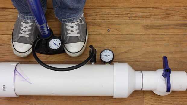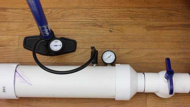 Una vez que el cañón está montado, está listo para presurizar la cámara de aire. Comenzar por el cierre de la válvula de bola. Conectar la bomba de aire a la válvula de aire. Luego, lentamente llene el tanque. Desea hacer esto poco a poco la primera vez porque es necesario comprobar cuidadosamente si hay fugas. Empezar por la presurización del tanque de aire a 10 PSI. Entonces escuche si hay fugas. Abrir cuidadosamente la válvula de bola para liberar la presión. Llenar el tanque otra vez. Esta vez vayas a 20 PSI. Otra vez Revise todas las uniones. Si todo se ve bien puede tomar hasta 30 PSI. Revise todas las juntas de nuevo. Luego tomar hasta 40 PSI. Deje que el tanque se sientan con 40 PSI durante unos minutos para ver si pierde presión con el tiempo. Si todo sigue pareciendo buena, puede estar bastante seguro que hiciste bien juntas por todas partes.