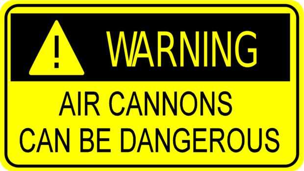 Siempre deben tener precaución cuando se trabaja con cañones de aire comprimido. No apunte el cañón directamente a personas. No deje el tanque presurizado durante largos períodos de tiempo. No presurice demasiado el tanque. Permanecer siempre muy por debajo de la presión nominal de sus partes. Mantener la presión por debajo de 40 psi.