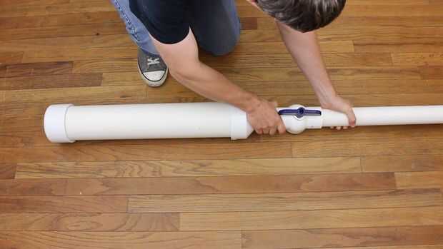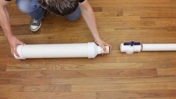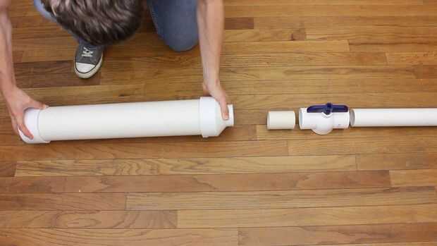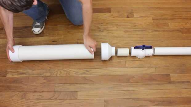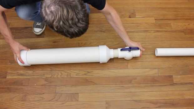Coloque la tapa de 4 pulgadas en un extremo de la tubería de 4 pulgadas y poner el reductor en el otro. Luego inserte el pedazo corto de tubería de 2 pulgadas en el reductor del montaje. Ajuste de la válvula. Por último montar en el pedazo largo de tubo de 2 pulgadas.