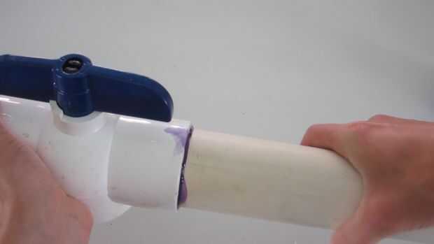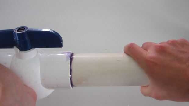Piezas de tubo de PVC se fijan juntos en un proceso llamado soldadura solvente. Las dos piezas de PVC esencialmente químicamente se derritió y cementadas juntos. Este proceso debe realizarse fuera o en un área bien ventilada.