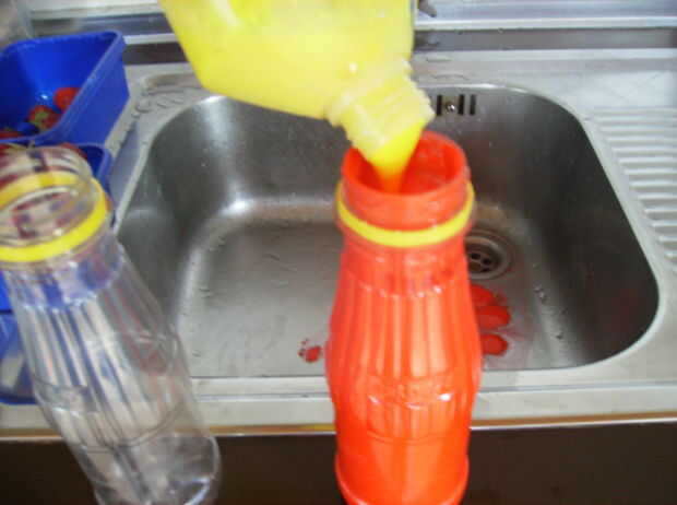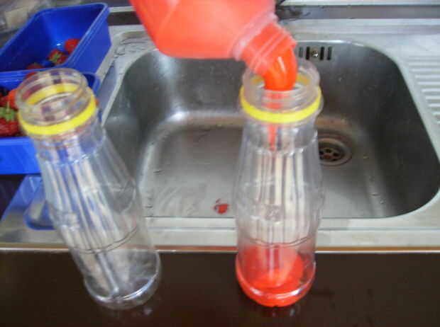 Después de llenar las botellas, puede pone la tapa en él y rellena el agujero con los partidos grabados.