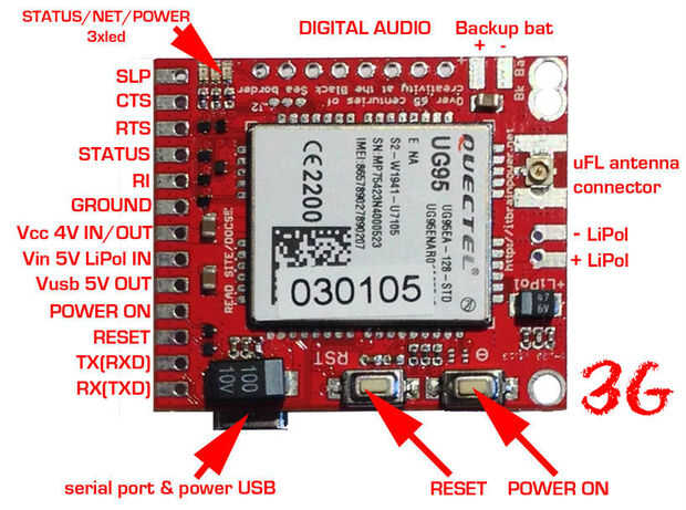 * Los escudos son 2 patillas compatibles, primero uno es banda cuádruple GSM solamente (mundo ancho compatible) y tiene soporte para 2SIMs y el segundo es solo SIM 3G solamente (versión norteamericana) / 3G + GSM (Europa y resto del mundo en la versión). Los escudos son compactos como 1.25"x1.57"(31.75x39.88mm) / 1.35"x1.57"(34.29x39.88mm), peso alrededor de 10g, con soporte (comunicación y alimentación), auto nivel 3V-5V digitales interfaces USB y cargador de polímero de litio integrada. Se puede interconectar directamente con placas Arduino (y clones), Raspberry PI (todas las versiones), hueso de Beagle u otras tarjetas de brazo Linux y con cualquier microcontrolador 3-5V.