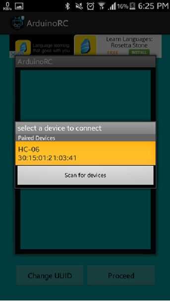 4. el botón de exploración. El teléfono buscará dispositivos disponibles. Después de encontrar el módulo de HC-06, el deberá seleccionarla.
