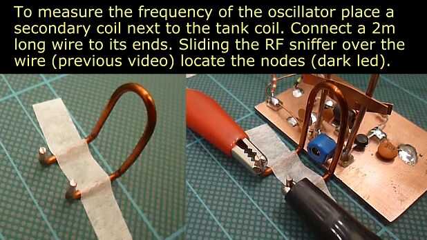 Para probar y ajustar el oscilador, coloque una sola vuelta bobina secundaria junto a L1. Conectar un bucle de alambre de 2 m en sus extremos y extenderlo sobre una mesa. Deslizando el sniffer de RF sobre uno de los cables será detectar los nodos (0 puntos) como manchas led. La distancia entre nodos adyacentes 2 es 1/2 longitud de onda de la frecuencia del oscilador. Este método fue utilizado por Ernst Lecher en 1880 para medir frecuencias de UHF con su "cables de calavera" (o líneas).