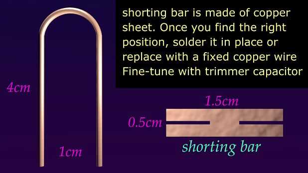 una resistencia de mantener de la L1 baja a altas frecuencias. Shorting bar hace L1 un inductor variable, permitiendo el ajuste grueso del oscilador entre 200 MHz y 900 MHz. C3, una tapa de cerámica trimmer para ajuste fino. Ponerlo en posición media antes de ajustar L1.
