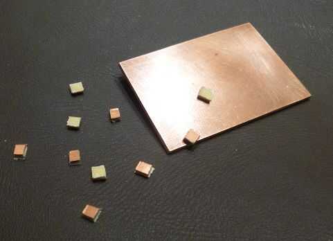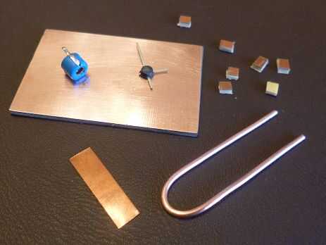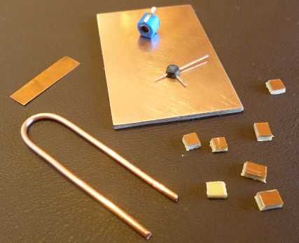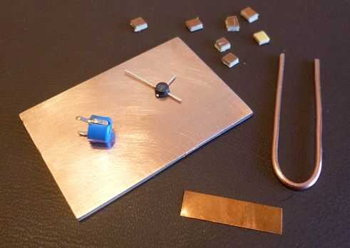 circuito está construido sobre un empaste tablero revestido de cobre. Pequeñas piezas cuadradas (4 x 4 mm) de material del tablero se pegan en la placa principal y componentes se sueldan a estas. Esto se llama "Construcción de estilo Manhattan" y es la mejor técnica de prototipos para circuitos de RF . Todas las conexiones de tierra se hacen a la placa principal. Se puede utilizar una placa sin soldadura que está plagado de capacitancias parásitas y las inductancias que en UHF se comportan como componentes del circuito real.
