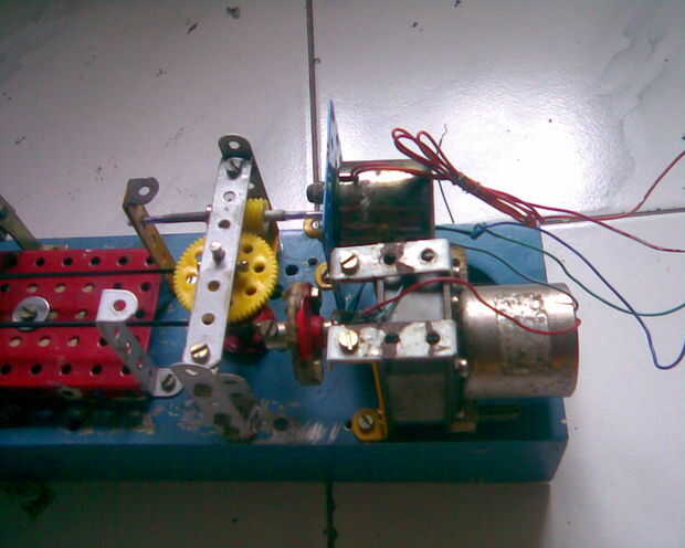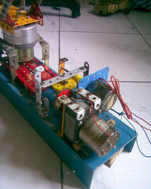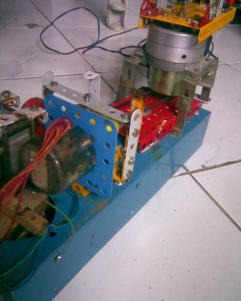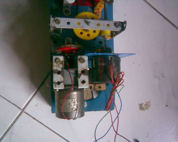 UN MOTOR DE LA GRABADORA SE UTILIZÓ PARA HACER LA GRÚA GIRE. EL MOTOR FUE CONECTADO CON OTRO MOTOR (CABEZA DEL VCR) POR BANDA DE CAUCHO.