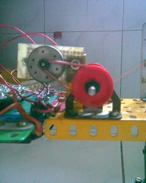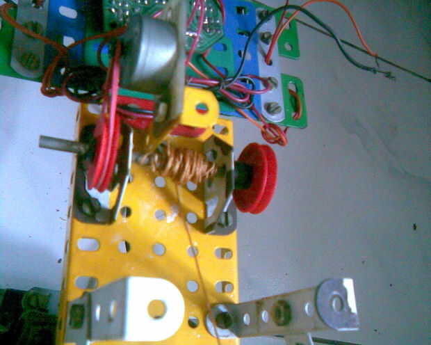 DESPUÉS DE COMPLETAR LA PARTE SUPERIOR DE LA GRÚA, HE ARREGLADO EL MOTOR, QUE OBTUVE DE UNA VIEJA GRABADORA DE CINTA A UNA POLEA DE GOMA. ESA POLEA ERA VENTEADA CON CASI 2 METROS DE CABLE.