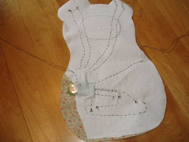 Usando la web fusable, coloque la muselina en la parte posterior de la pieza frontal del oso. La web fusable hace más rígida la tela, fijar tan sólo algunos puntos sobre la muselina a la pieza frontal para mantenerlos juntos y mantener los hilos de rosca de paso.