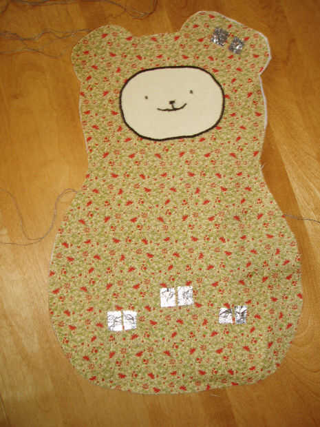 Diseño de una cara y utilizar la web fusable para colocar al frente del oso. Con una puntada ancha, contorno de la cara y hacer una linda carita.
