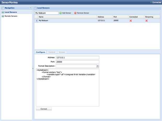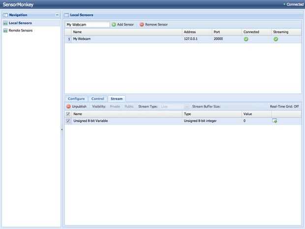 Una vez conectado, puede acceder al panel de control basado en web a través del enlace 'Sensores' en la parte superior de la página. El panel de control es donde conectar el Arduino y publicar su flujo directo sobre Internet.