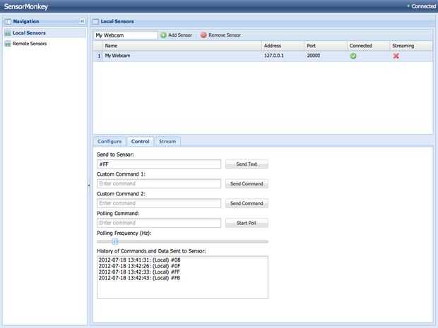 Después de hacer clic en 'Conectar', vaya a la pestaña 'Control' donde pueda probar mi pan y tilt montaje enviando comandos a Arduino. Prefijando los comandos con un símbolo de # SensorMonkey interpretará el texto como pares de caracteres hexadecimales (es decir, binario octetos). Así, por ejemplo, puedo instruir a la cacerola e inclinación montaje para asumir una rotación de 180 grados en ambos ejes por escribir #FF en el campo de texto y pulsando retorno de mi teclado (o haga clic en el botón 'Enviar Text'). Pruebe las siguientes combinaciones para probar su pan y tilt montaje (tenga cuidado de no exceder el rango de rotación práctica de sus servomotores):