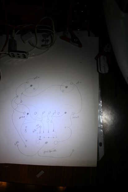 Hice un dibujo para intentar averiguar lo que estaba conectado a lo que. Mi teoría era que habría un terreno común para todos los botones (todos se conectaron juntos) y habría un rastro va desde cada botón a través de un resistor a la viruta. Yo había planeado para el pulgar de mi guante para conectarse a tierra y para cada dedo en la misma mano que un botón, con dos de los dedos con dos botones.