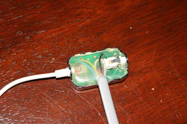 No fui tan afortunado... el respaldo no cabe más. Así que "potted" todo de pegamento caliente para parar de moverse. Antes de hacer esto, prueba el cable de nuevo y asegúrese de que todo funciona! En este punto, he decidido que si el pegamento fluyó a la parte delantera y dejado los botones antiguos de trabajo, estaría bien. También tuve cuidado de dejar abierta la conexión de audio, pero para sellar todo lo demás en aras de la resistencia al agua.