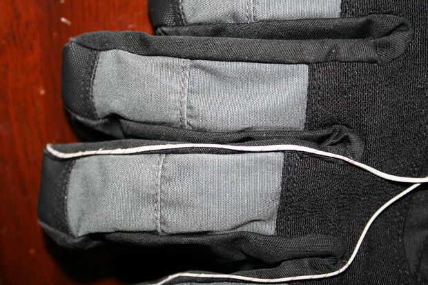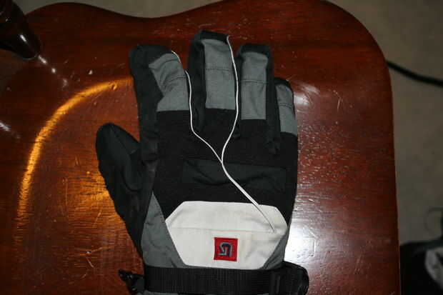 Realmente, como mis guantes y quería permanecer impermeable, especialmente en los dedos ya que con frecuencia cavan en la nieve! Por desgracia, mis camisas de guante no salen así que terminé enrutamiento del cable en el exterior. Es un guiño a la moda geek y circuitos suaves. Saco el forro de la concha en la punta de los dedos lo suficiente para asegurarse de que no perforarla. Tejido mágico de Robert Gore no tienen por qué temerme!