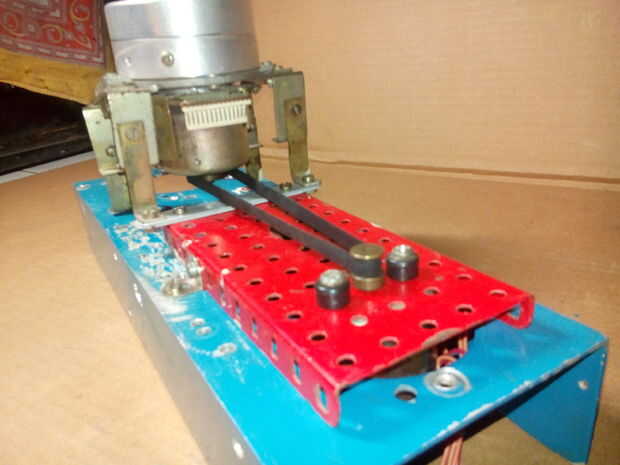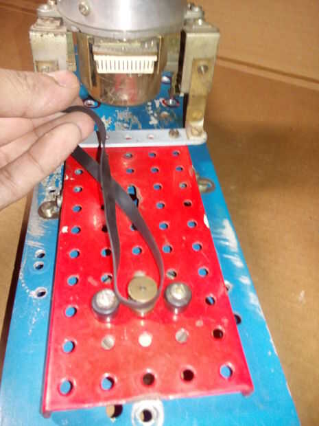 AHORA PONEMOS LA POLEA EN EL EJE DEL MOTOR Y APRETADO EL TORNILLO DE LA POLEA PARA QUE LOS RESTOS DE LA POLEA FIJA FIRMEMENTE SOBRE EL EJE. DESPUÉS DE QUE INSERTE GOMA DE BANDA EN LA POLEA DEL MOTOR DE LA C.C. ESTIRARLO E INSERTARLO EN EL VCR CABEZA MOTOR POLEA COMO SE MUESTRA EN LA IMAGEN DE ARRIBA.