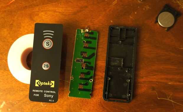 Ver foto 1. El Opteka RC-3 control remoto conists de un plástico del soporte, una bandeja de la batería, una batería, un tablero de circuitos, tornillos que sostienen el tablero del circuito hacia abajo, y una fina lámina de plástico pegan a la cara de todo. Use una navaja para pelar la cara del mando a distancia. Tenga cuidado de no ensuciarse el lado pegajoso porque esto volverá más tarde. Quite los tornillos de la placa de circuito y pop el tablero del circuito hacia fuera.