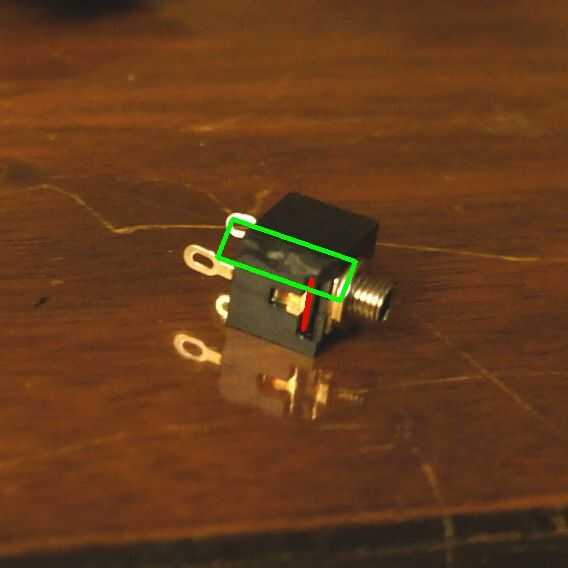 Ver foto 3. Utilizando la dremel y un disco de corte, corte el contacto que sale del lado de la toma de audio (línea roja en la foto). Sólo queremos dejar los dos en la parte posterior. También puede ayudar a redondear la esquina de la toma de audio (zona verde en la foto).