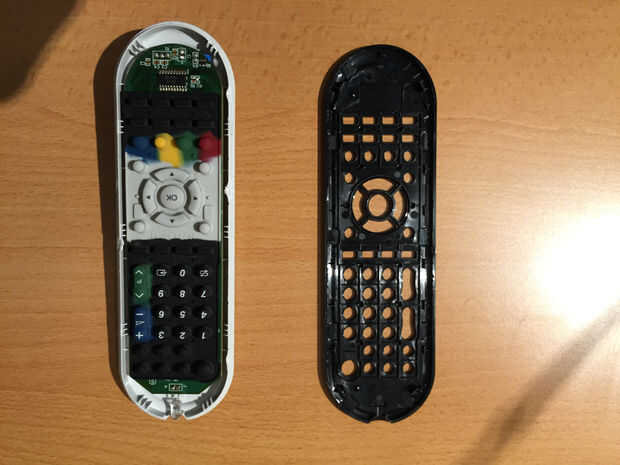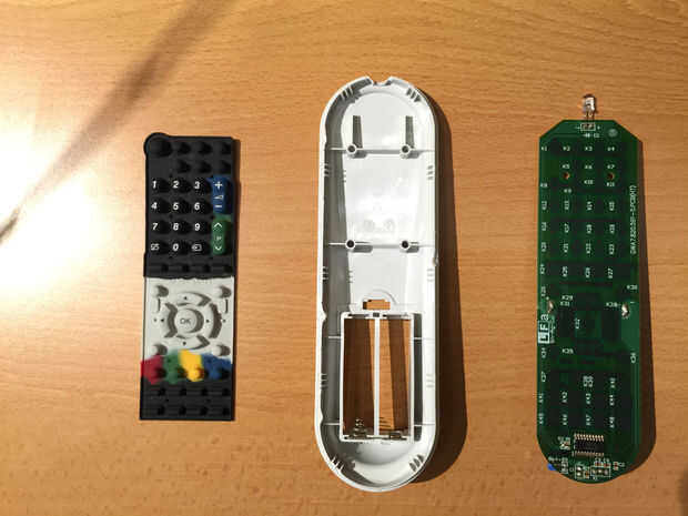 Cuando se hacen mediante la Unión roscada y desmontar la pieza, retirar el circuito y la capa de botones, tomando parte la parte inferior media del mando a distancia, la parte que vamos a foco.
