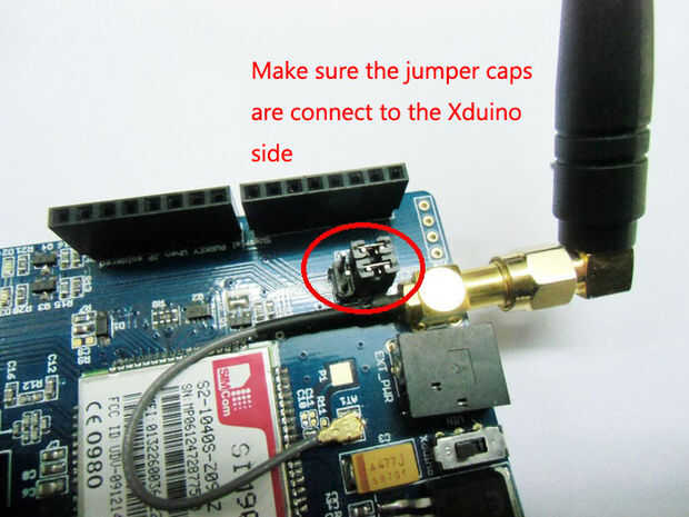 Hay tres pernos pernos de 2 * 3 en la pantalla GPRS. Puedes ver la marca de seda en ambos lado de las clavijas de un lado es Xduino (es conectarse por el puerto serial del hardware) y el otro lado es SWserial (este lado se utiliza como puerto serial software). Así como la imagen, conecte las tapas de puente para el lado de Xduino.