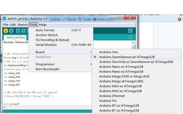 A continuación, abra este archivo por Arduin IDE. Cargar el programa en el Crowduino, tenga en cuenta que no conecte el blindaje GPRS a Crowduino al cargar el programa, muy importante!