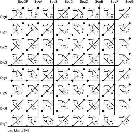 Este IC de controlador tiene 8 pins "dígitos" (0-7) y 8 pernos "segmento" (SegA-SegF y SegDP). Si piensas en pernos de dígitos como filas y pernos de segmento como LEDs individuales, se puede ver cómo 64 LED puede ser utilizado. Porque cada fila puede tener hasta 8 LED ' s todo lo que hacemos es conectar los cátodos de estos 8 LEDs juntos y luego a un pin de dígitos (es decir, DIG0) de MAX72xx chip. Ánodo de cada uno de 8 LED ' s conectado luego a plomo solo del segmento de la IC. Para la primera fila que usando los cables 9 (1 a DIG0) y 8 SEG.