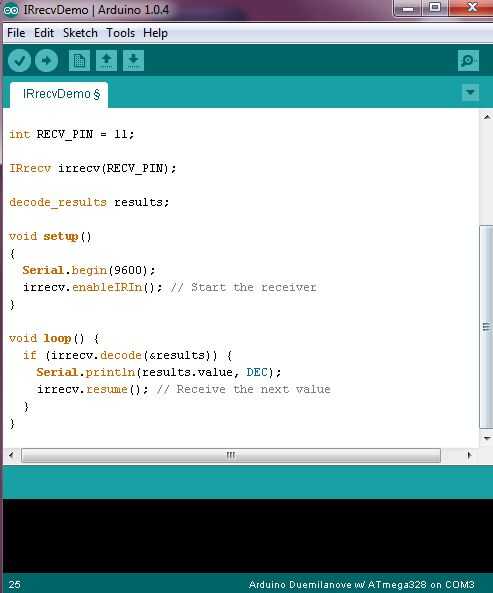 Abra el IDE y vaya a archivo>ejemplo>IRremote>IRrecvDemo