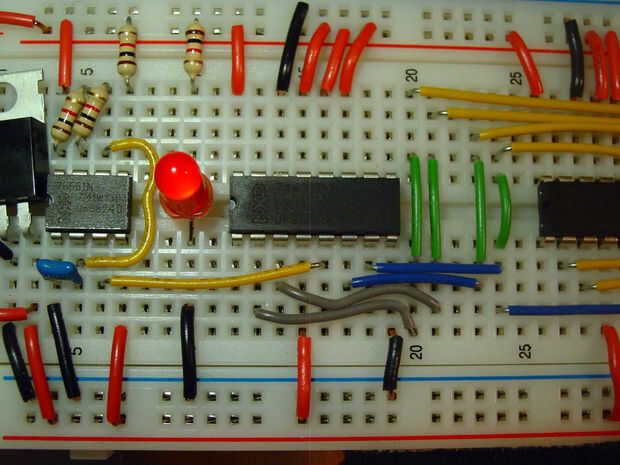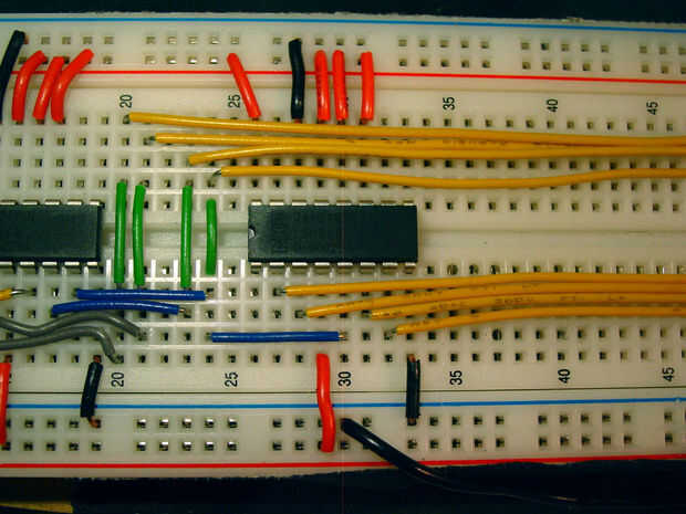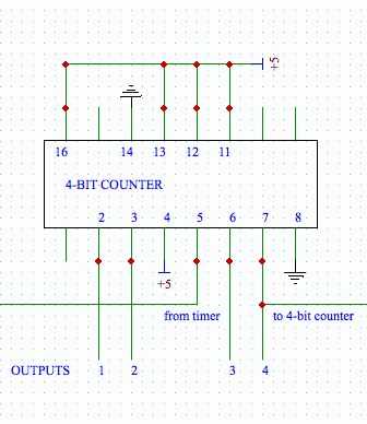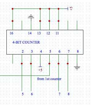 Construir otro contador de 4 bits de la misma manera. En lugar de conectarse a la entrada en el pin 5 el 7555, conecte al pin 7 del contador anterior. Los cables amarillos de la imagen apuntan a la salida a un lugar diferente en el tablero para facilitar el acceso.